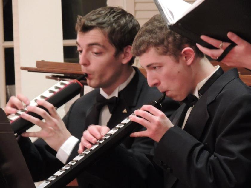 University of Maine University Singers (and piano majors) Aaron Waldman and Will Sawyer, pressed into keyboard service – photo from the Singers’ current regional tour.