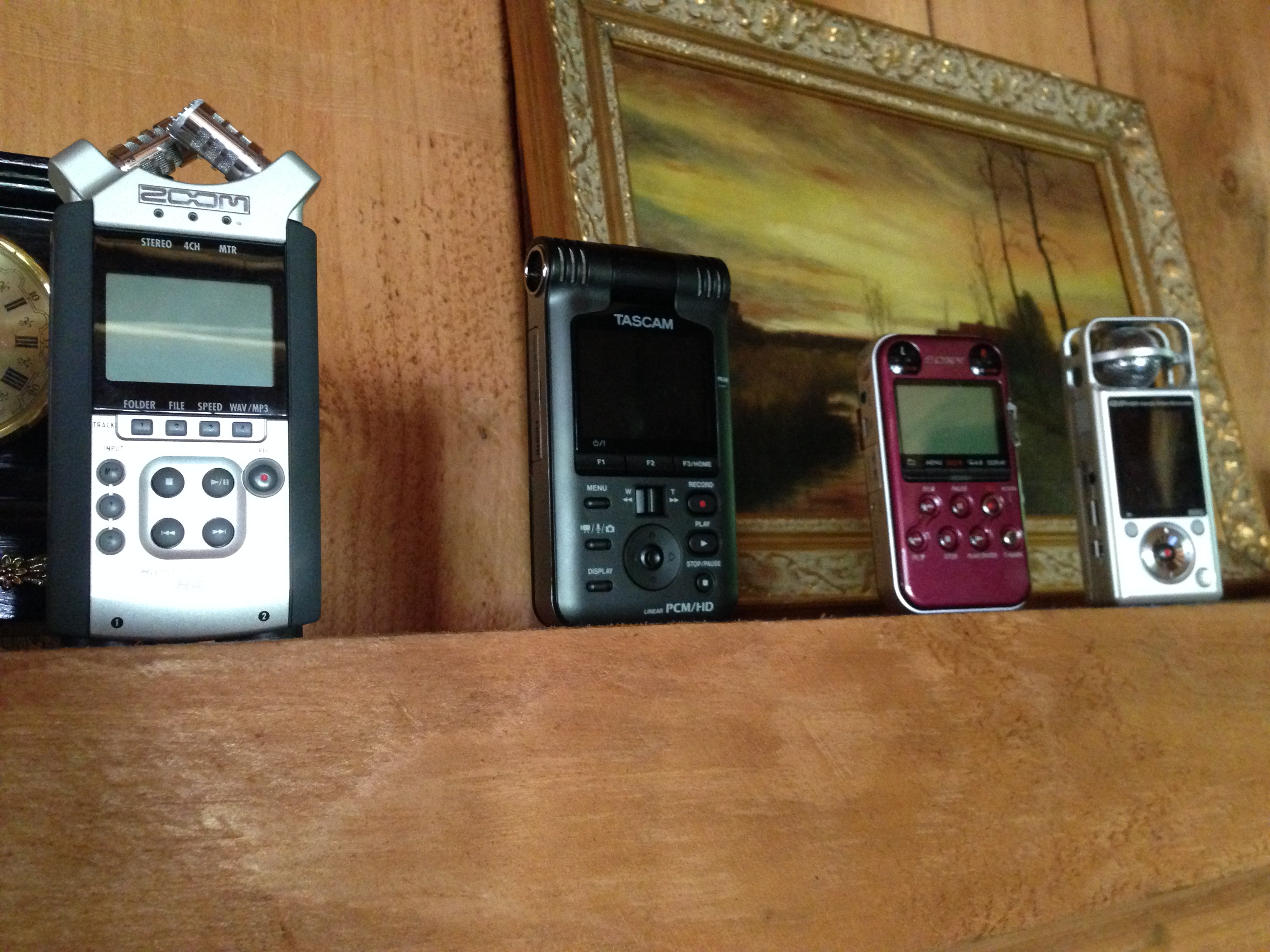 If you want to keep score, that’s a Zoom H4n, a Tascam PCM/HD, a Sony PCM/M10, and a Zoom Q2HD. They are arrayed on the mantle of the family house in Vermont, having just been used to record a new solo bass clarinet piece of mine. I tried to make the levels relatively similar, though doing this just using the visual meters wasn’t all that accurate.