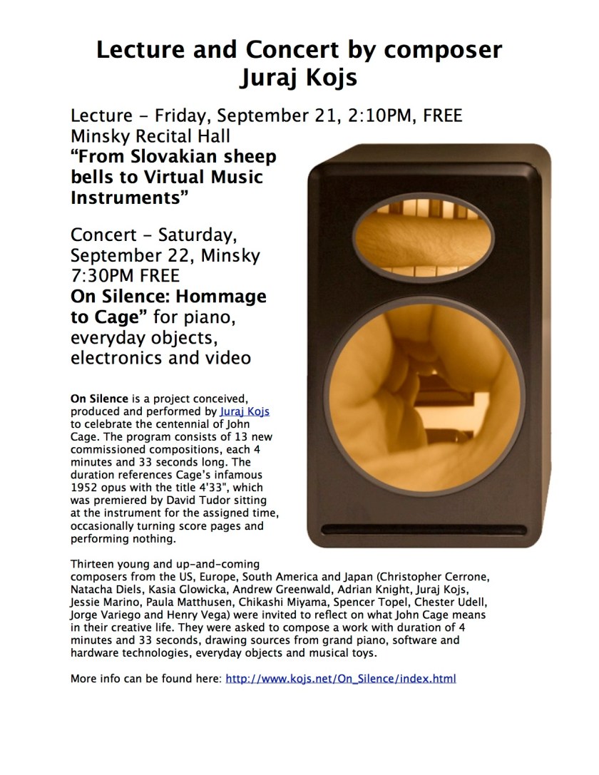 Here we are, September 1st, and already many plans have to be made for rehearsals and travel plans finalized for gigs, etc. Luckily, the first real concert event at UMaine that I’m involved in this fall is really someone else’s show – my former student Juraj Kojs, will be lecturing and performing a concert that he curated in honor of the Cage Centennial. Here’s some basic info on his UMaine events: